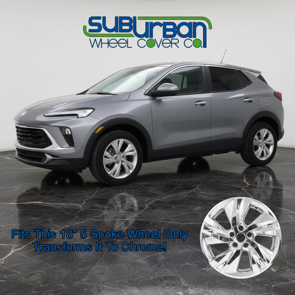 This premium 18" chrome wheel skin fits 2024-2026 Buick Encore Preferred models with the matching 5 spoke aluminum wheel only (see vehicle photo). They are simple to install and instantly give the appearance of a real chrome wheel. They are made out of durable triple chrome plated plastic.