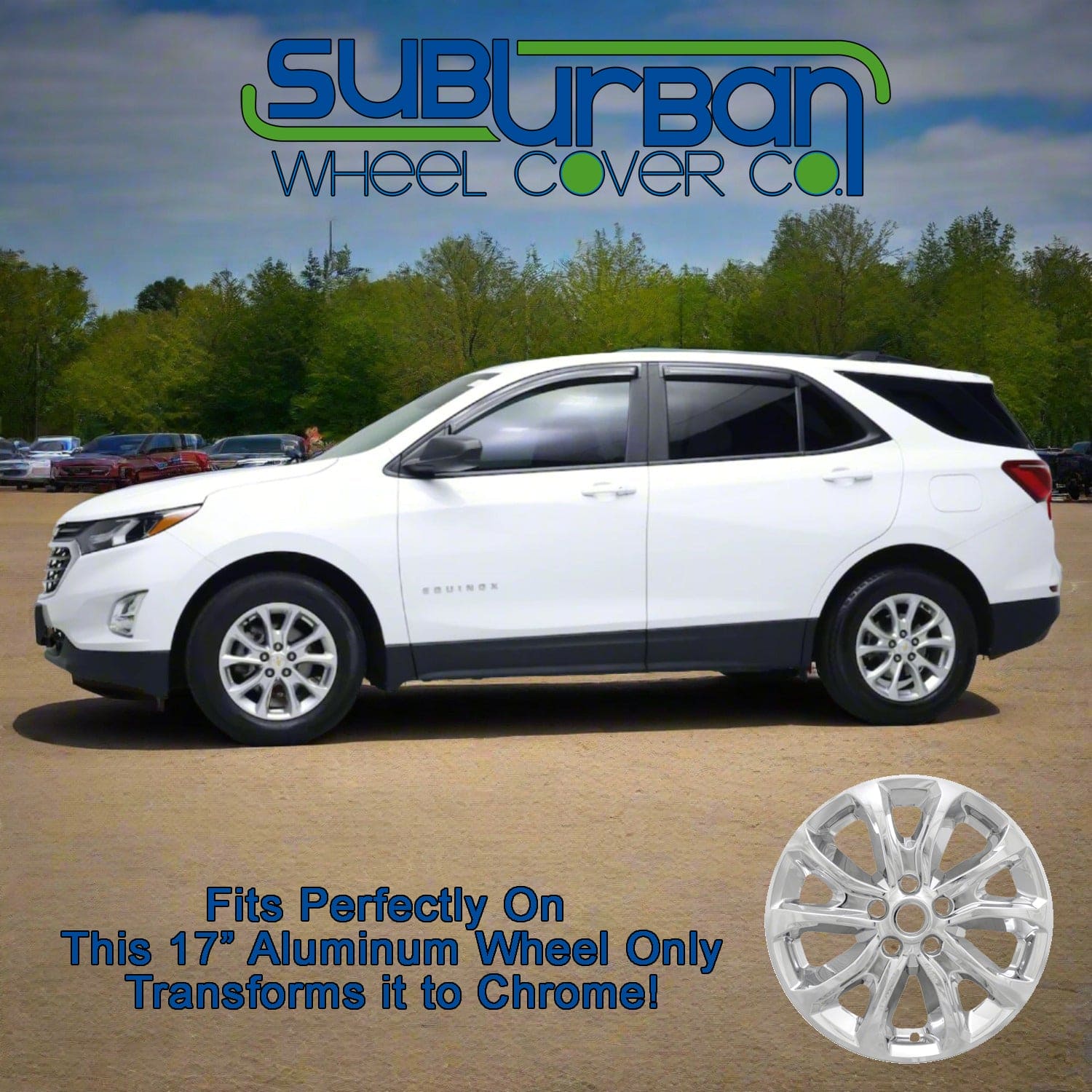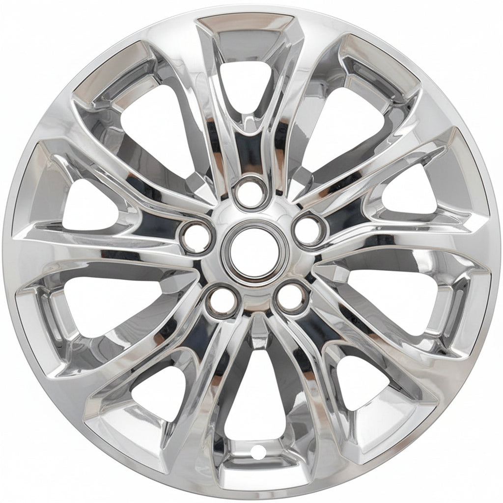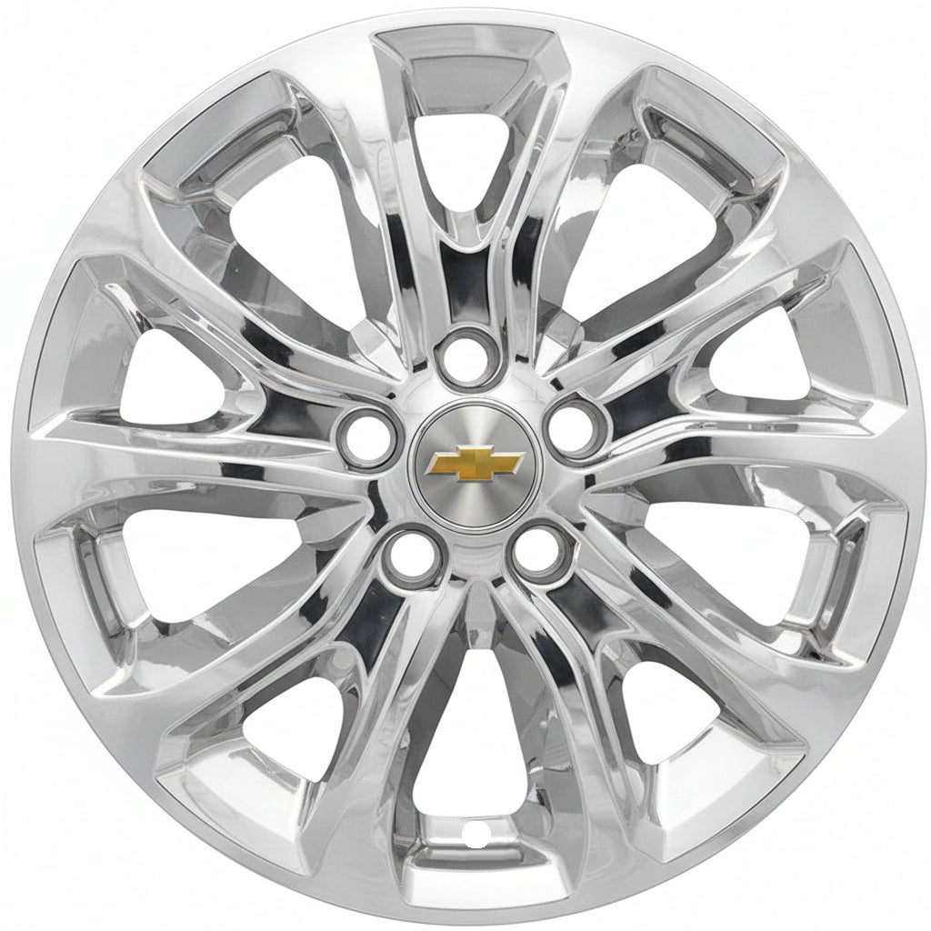 This 17" chrome wheel skin fits 2018-2021 Chevrolet Equinox models with the matching 10 spoke aluminum wheels only (see vehicle photo). They are simple to install and instantly give the appearance of a real chrome wheel. They are made out of durable chrome plated plastic. The Chevy center cap that is shown is not included but should already be on the vehicle.