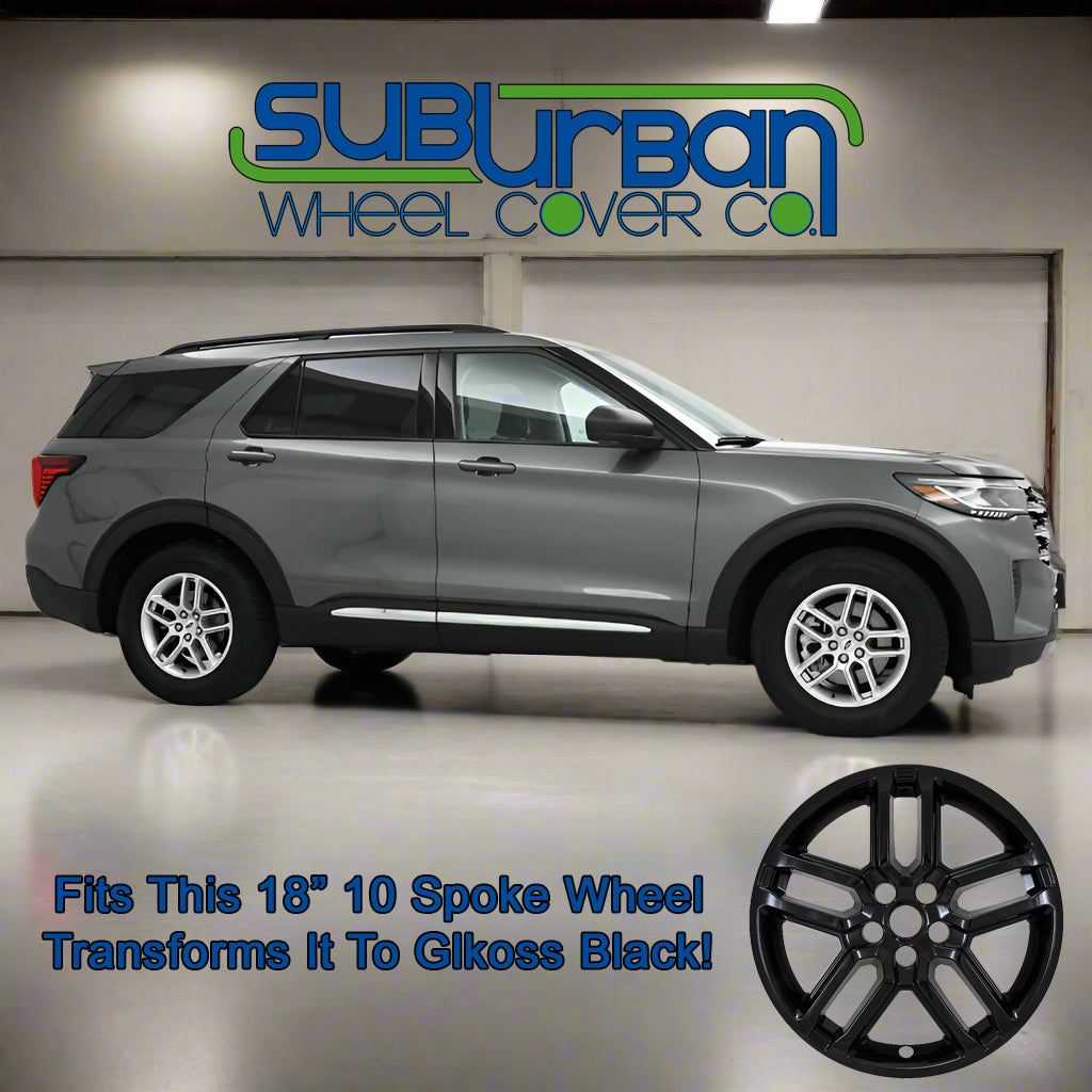 This 18" gloss black wheel skin fits 2025-2026 Ford Explorer Active models with the matching 10 spoke aluminum wheels only (see vehicle photo). They are simple to install and instantly give the appearance of a real gloss black wheel. They are made out of durable painted ABS plastic.