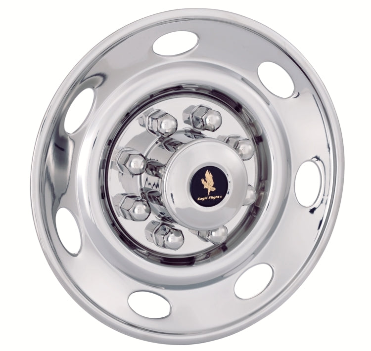 These Eagle Flight brand 16" single wheel simulators fit 1992-1998 Ford F250 / F350 2WD trucks. They have a polished stainless steel finish for lasting beauty and durability. These D.O.T. Liners feature an easy jam nut bolt on design for a very secure fit.