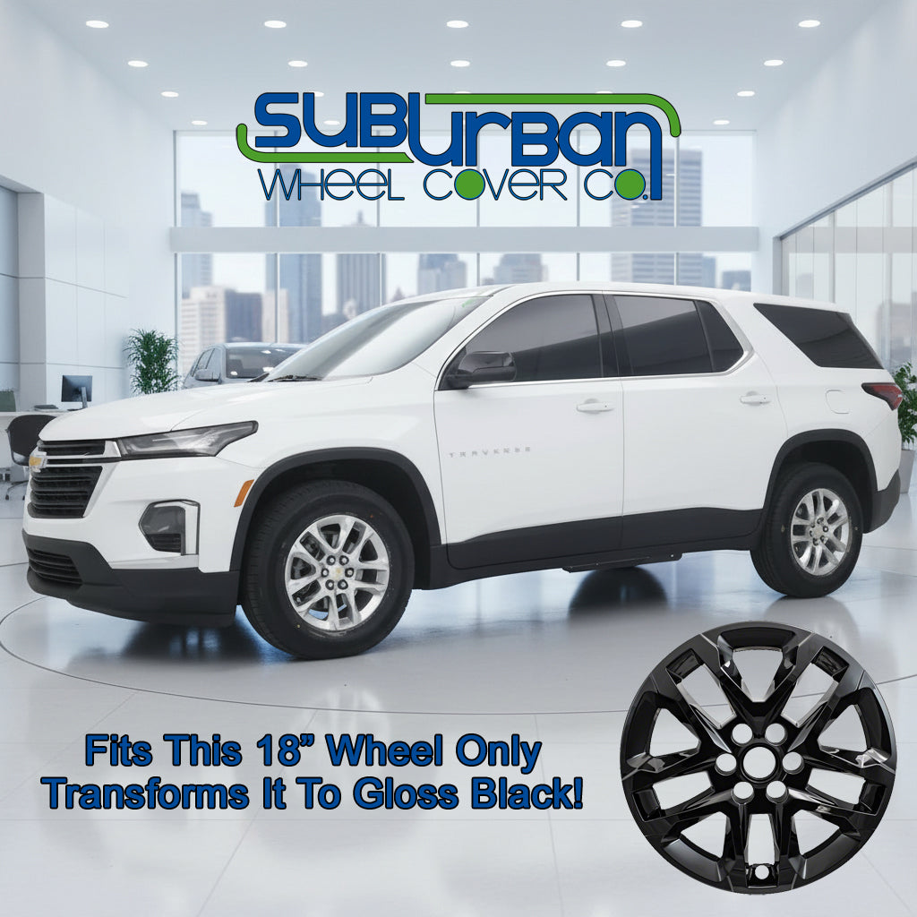 This 18" gloss black wheel skin fits some 2018-2023 Chevrolet Traverse L, LS and LT models. To fit the vehicle must have the matching 10 spoke aluminum wheels only (see pictures). They are simple to install and instantly give the appearance of an actual gloss black wheel. They are made out of durable gloss black painted plastic. Your existing Chevrolet center cap will show through the opening in the middle for a factory appearance. Center caps are not included.