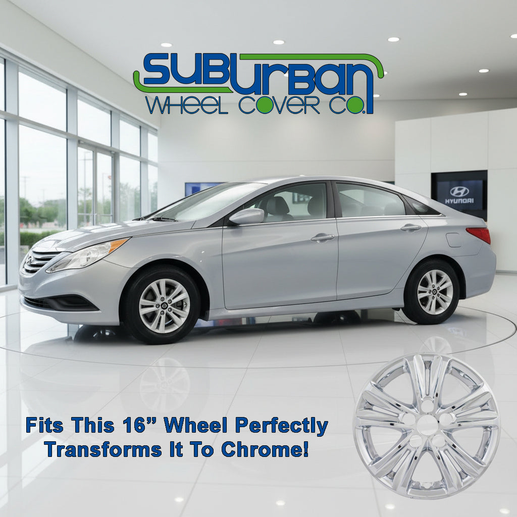 This 16" chrome wheel skin fits 2011-2014 Hyundai Sonata GLS models with the matching 10 spoke aluminum wheel only. They are simple to install and instantly give the appearance of a real chrome wheel. They are made out of durable chrome plated plastic.