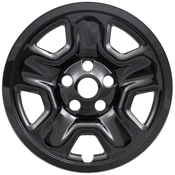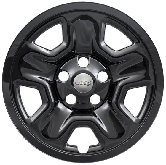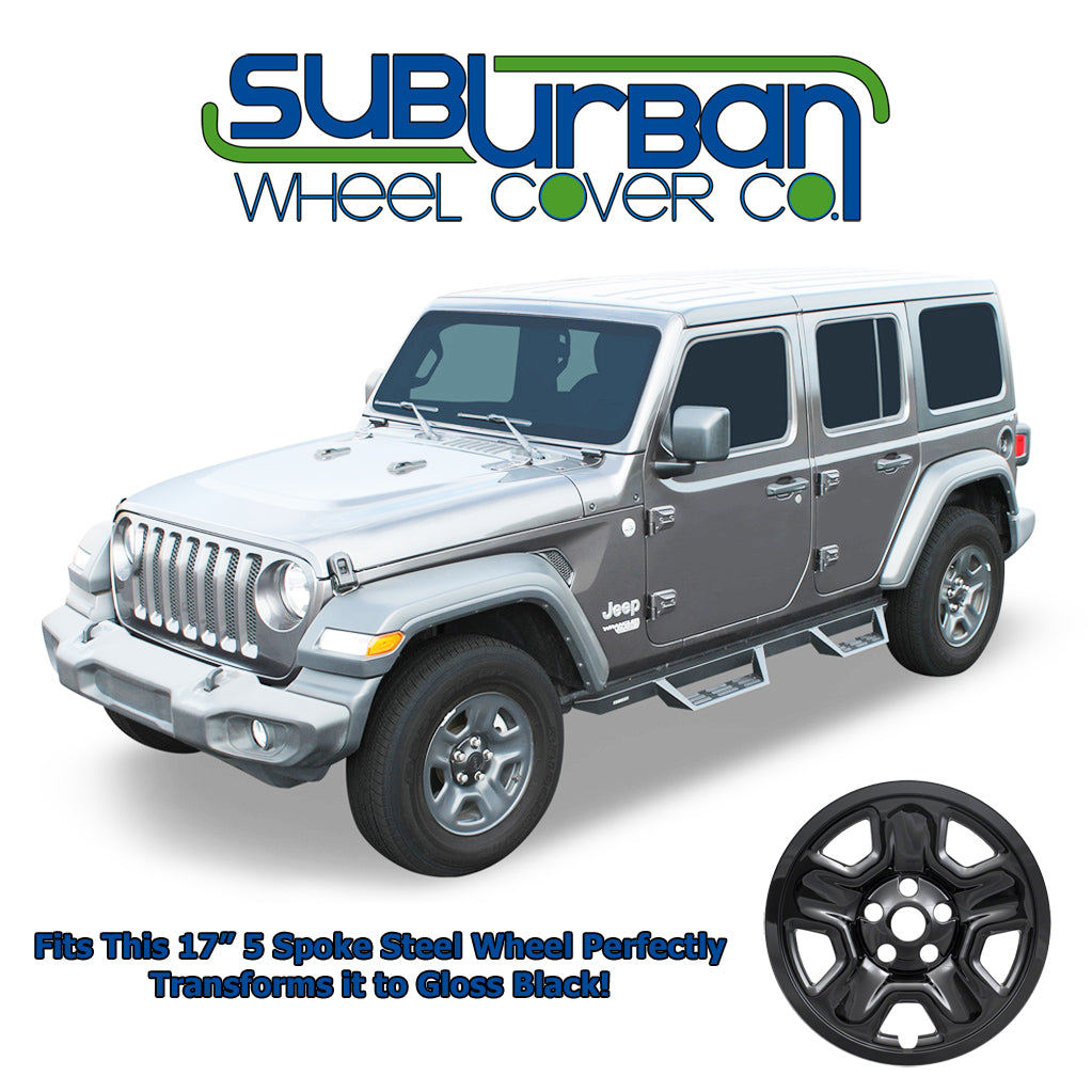 This 17" gloss black wheel skin fits 2018-2025 Jeep Wrangler models with the matching 5 spoke steel wheel only. They are simple to install and instantly give the appearance of a real black wheel. They are made out of durable gloss black painted plastic. The center opening allows your existing Jeep center cap to show through for a factory Jeep appearance.