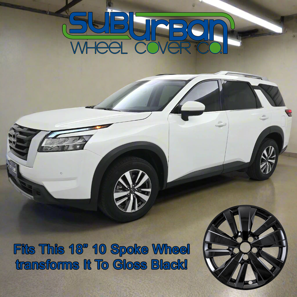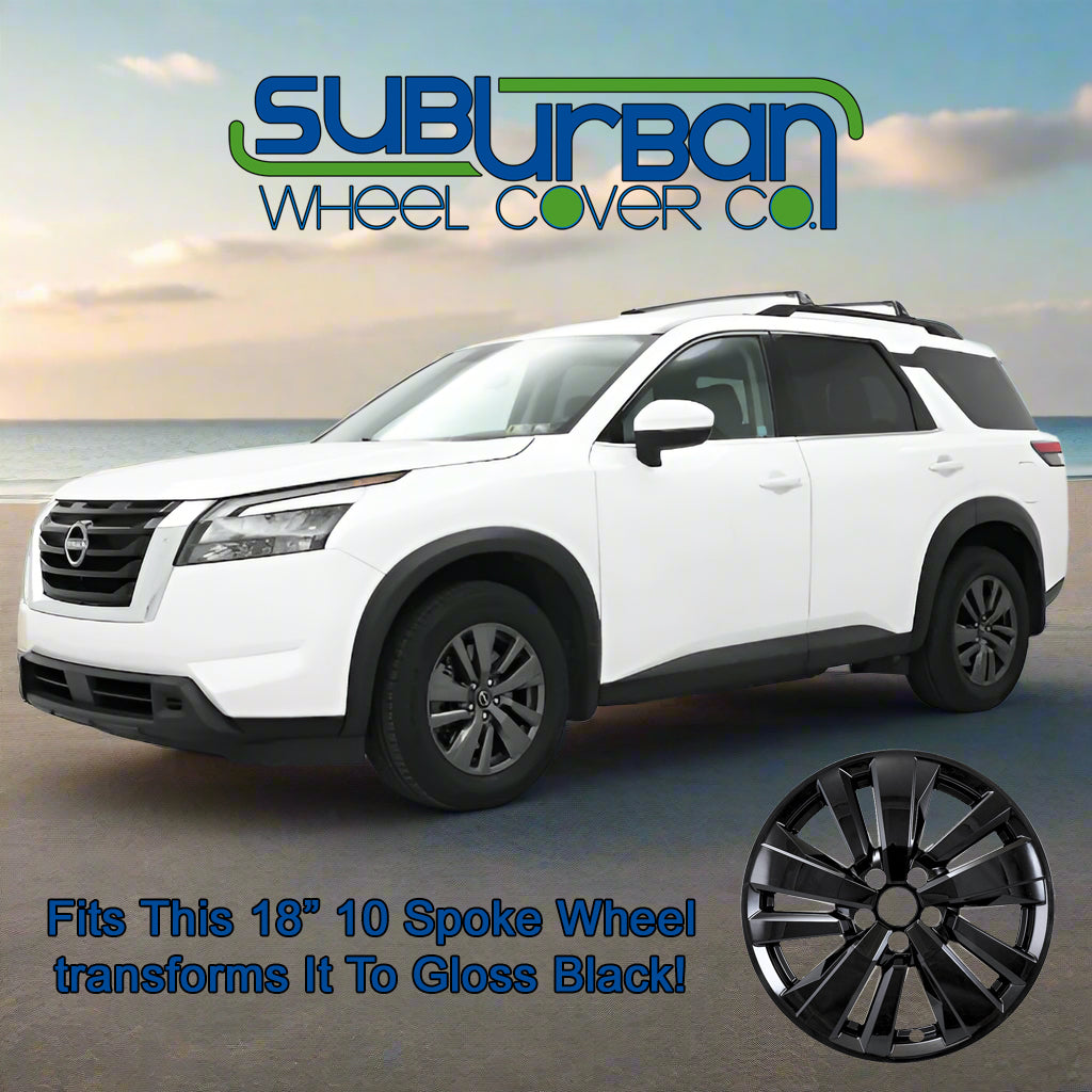 This gloss black wheel skin fits 2022-2026 Nissan Pathfinder models with the matching 10 spoke 18" aluminum wheels only (see vehicle photo's). It fits the 18" machined finish and the 18" all gray painted wheels. These are the only wheels that they will fit. They are simple to install and instantly give the appearance of an actual gloss black wheel. They are made out of durable gloss black painted plastic.