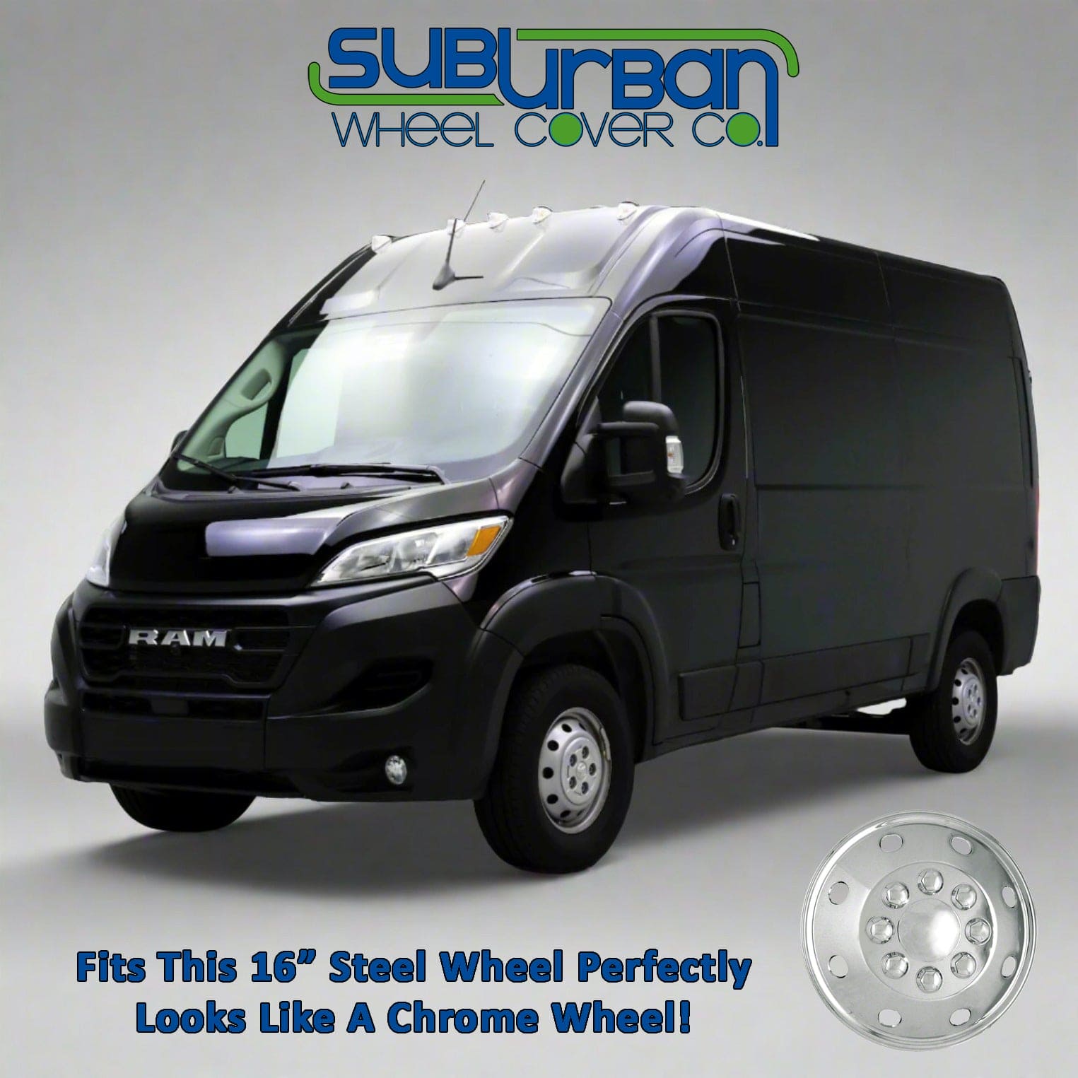 Here is a great looking 16" chrome plastic hubcap for 2014-2024 Ram Promaster 1500, 2500 and single wheel 3500 vans. These hubcaps have metal clips for a good tight fit. They do mot fit dual wheel Promaster 3500 models.