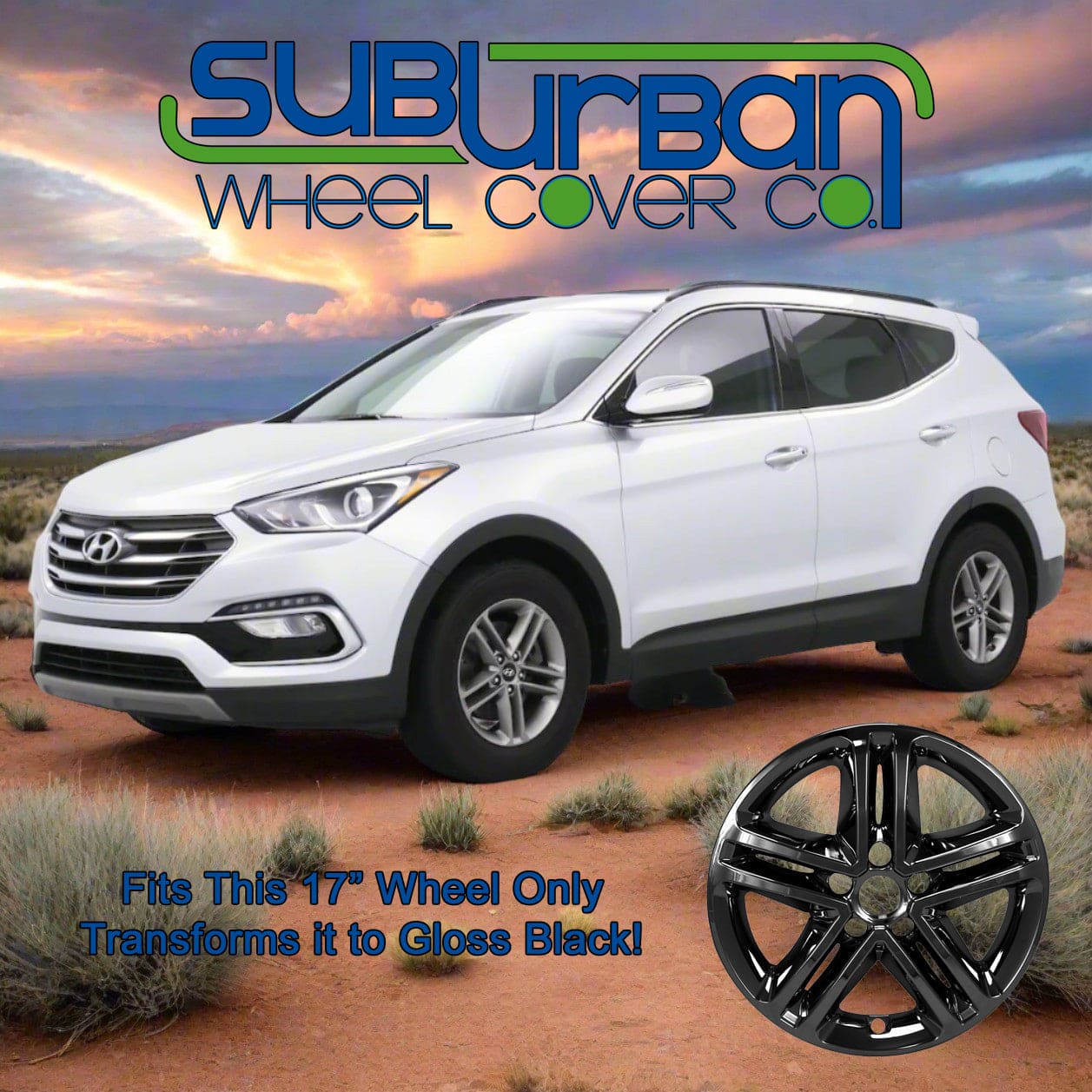 This 17" gloss black wheel skin fits 2017-2018 Hyundai Santa Fe Sport models with the matching 17" 10 spoke aluminum wheel only (see vehicle photo). They are simple to install and instantly give the appearance of a real black wheel. They are made out of durable gloss black painted plastic.