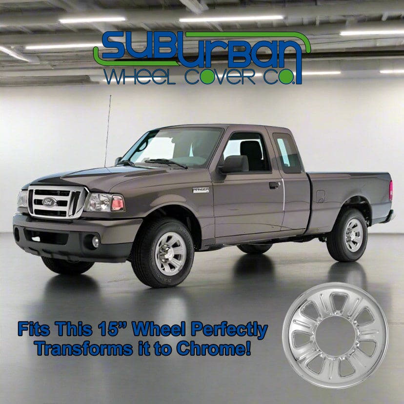 This 15" chrome wheel skin fits 2001-2011 Ford Ranger models with the matching 7 spoke styled steel wheel only (see example photo's). They are simple to install and instantly give the appearance of a real chrome wheel. They are made out of durable chrome plated plastic.
