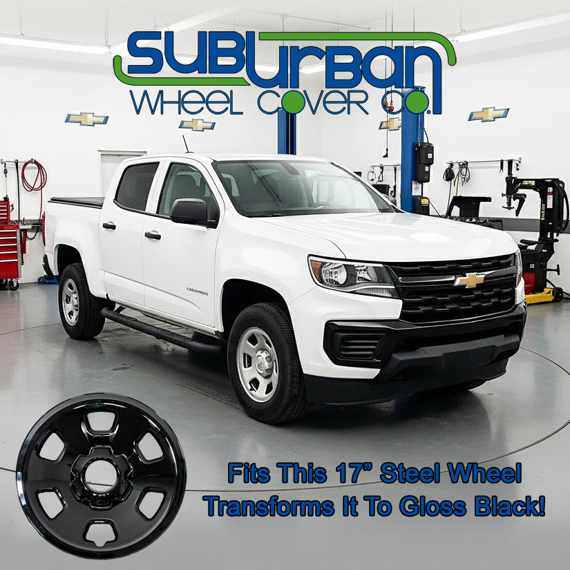 This 17" gloss black wheel skin fits 2021-2022 Chevrolet Colorado WT models with the matching 17" styled steel wheel only (see truck photo). They are simple to install and instantly give the appearance of a real black wheel. They are made out of durable gloss black painted plastic.