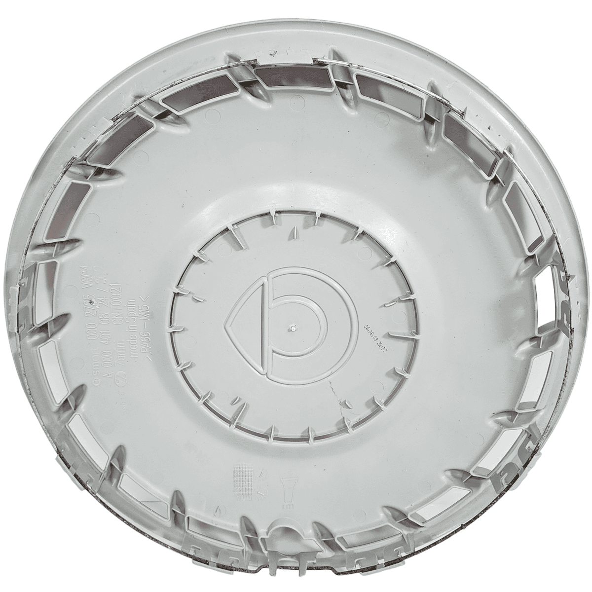This 15" 18 slot hubcap / wheel cover fits the 2008-2015 Smart Fortwo. The original part number is 451-4010224-C20L. The mold number on the back is A0004010824.