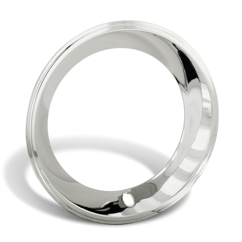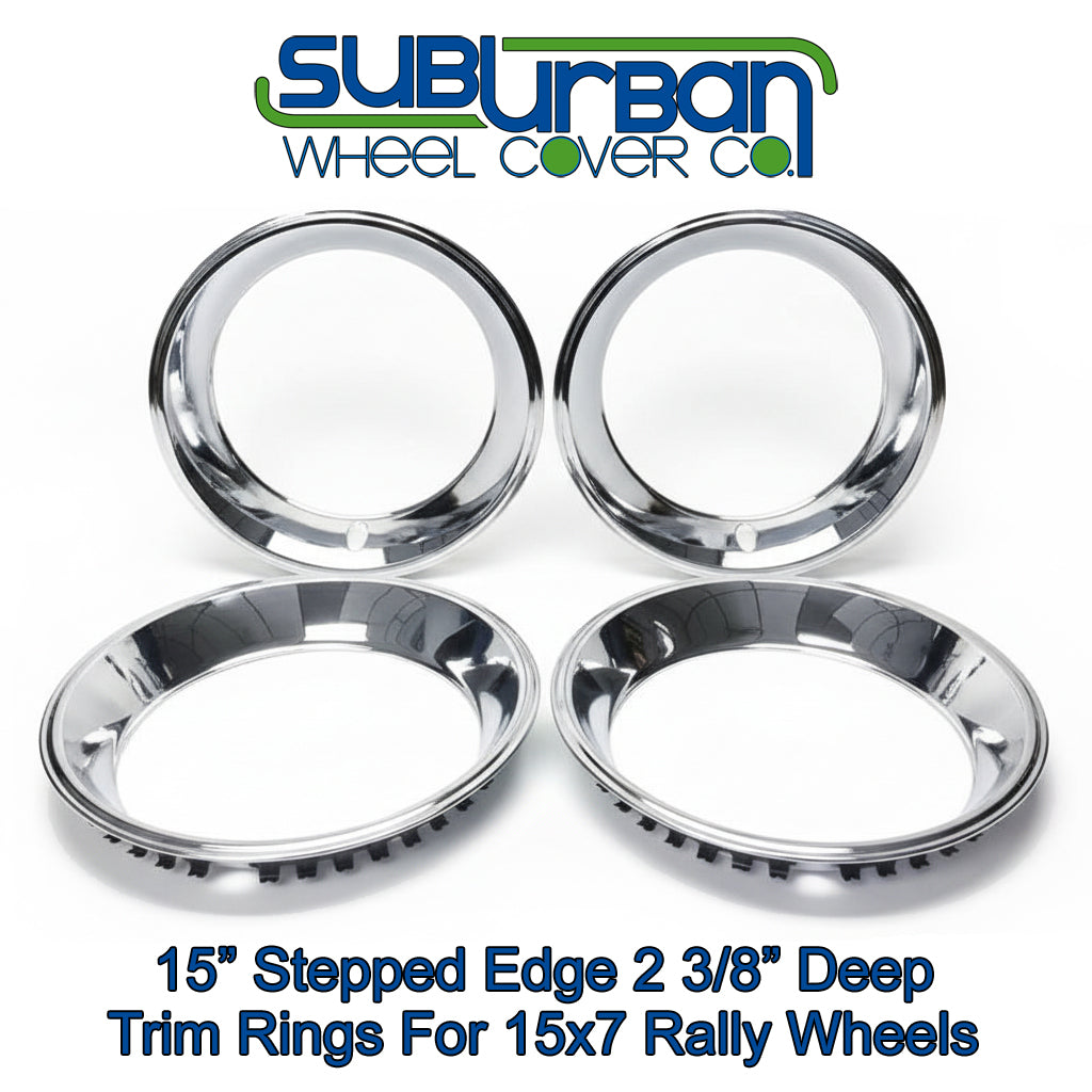 These stepped edge high quality chrome stainless steel trim rings will improve the appearance of wider rally type wheels. They have an approximate depth of 2 3/8" and are perfect for 15x7 steel rally wheels. Full 360 degree steel retention clips are used for a great fit.