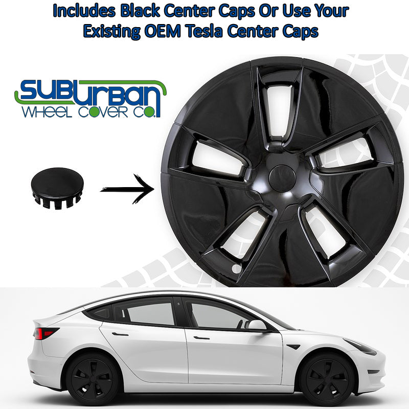 Here is a great looking set of 18" gloss black replacement hubcaps for 2017-2023 Tesla Model 3 vehicles. These hubcaps fit perfect. The quality is comparable to original Tesla hubcaps. These hubcaps include optional plain gloss black center caps or you can use your existing Tesla center caps.