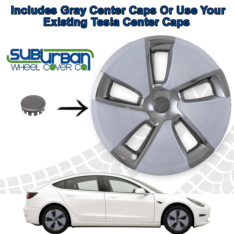 Here is a great looking set of 18" two tone replacement hubcaps for 2017-2023 Tesla Model 3 vehicles. These hubcaps fit perfect. The quality is comparable to original Tesla hubcaps. These hubcaps include optional plain center caps or you can use your existing Tesla center caps.
