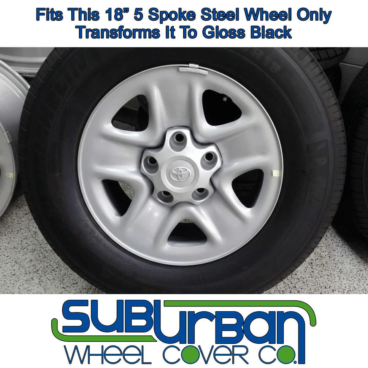 This 18" gloss black wheel skin fits 2007-2021 Toyota Tundra models with the matching 5 spoke styled steel wheel only (see vehicle photo). They are simple to install and instantly give the appearance of a real black wheel. They are made out of durable gloss black painted plastic.