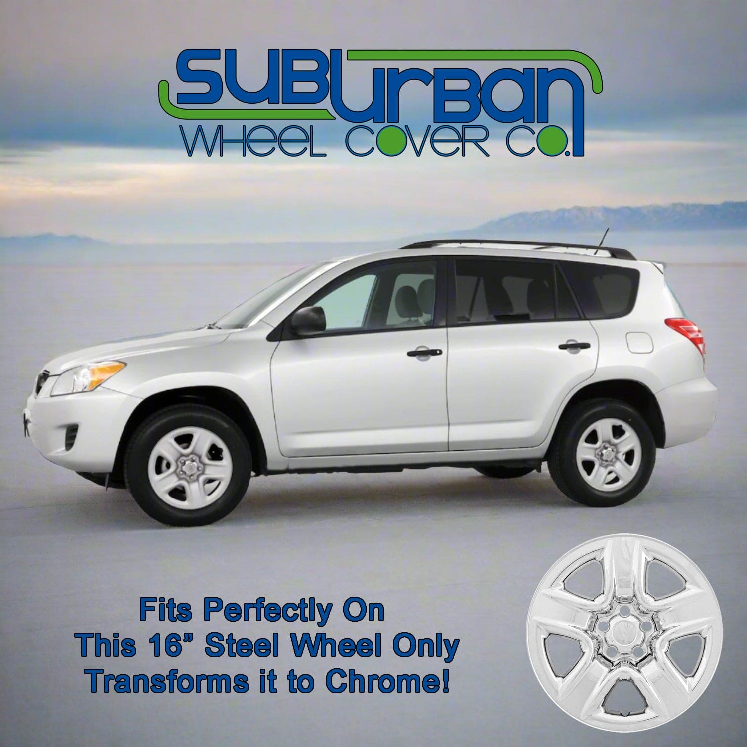 This 17" chrome wheel skin fits 2006-2012 Toyota RAV4 models with the matching 5 spoke steel wheel only. They are simple to install and instantly give the appearance of a real chrome wheel. They are made out of durable chrome plated plastic.